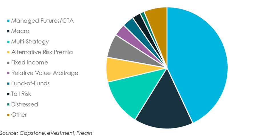 Analyzing portfolio holdings, we find that investors are overwhelmingly turning to trend-following, with managed futures strategies representing almost half of all defensive allocations. Macro hedge funds are the next largest, followed by multi-strategy funds and alternative risk premia. Tail risk hedging allocations are also present with smaller nominal allocations, but these strategies typically only require a small investment to protect a significant part of the portfolio. (See Fig. 2)
